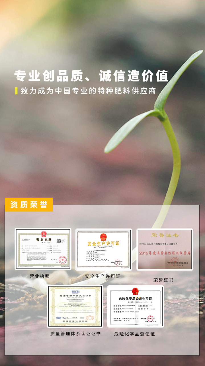 經(jīng)過二十余年的探索和實(shí)踐,依托自身技術(shù)和出口背景,按照國際市場規(guī)范培養(yǎng)了大批高素質(zhì)的專業(yè)化技術(shù)化團(tuán)隊,掌握了水溶性肥料的核心技術(shù),擁有完善的研發(fā)中心、質(zhì)檢中心,目前已獲得多個國家專利技術(shù)。公司一直把“做中國專業(yè)的特種肥料供應(yīng)商”作為自身的發(fā)展使命。推廣高端植物營養(yǎng)與先進(jìn)技術(shù),高效施肥方式的綜合配套方案,減輕中國種植業(yè)勞動強(qiáng)度,讓種植業(yè)效率更高、效果更強(qiáng)、效益更好!努力成為革新中國種植業(yè)生產(chǎn)方式的偉大公司!